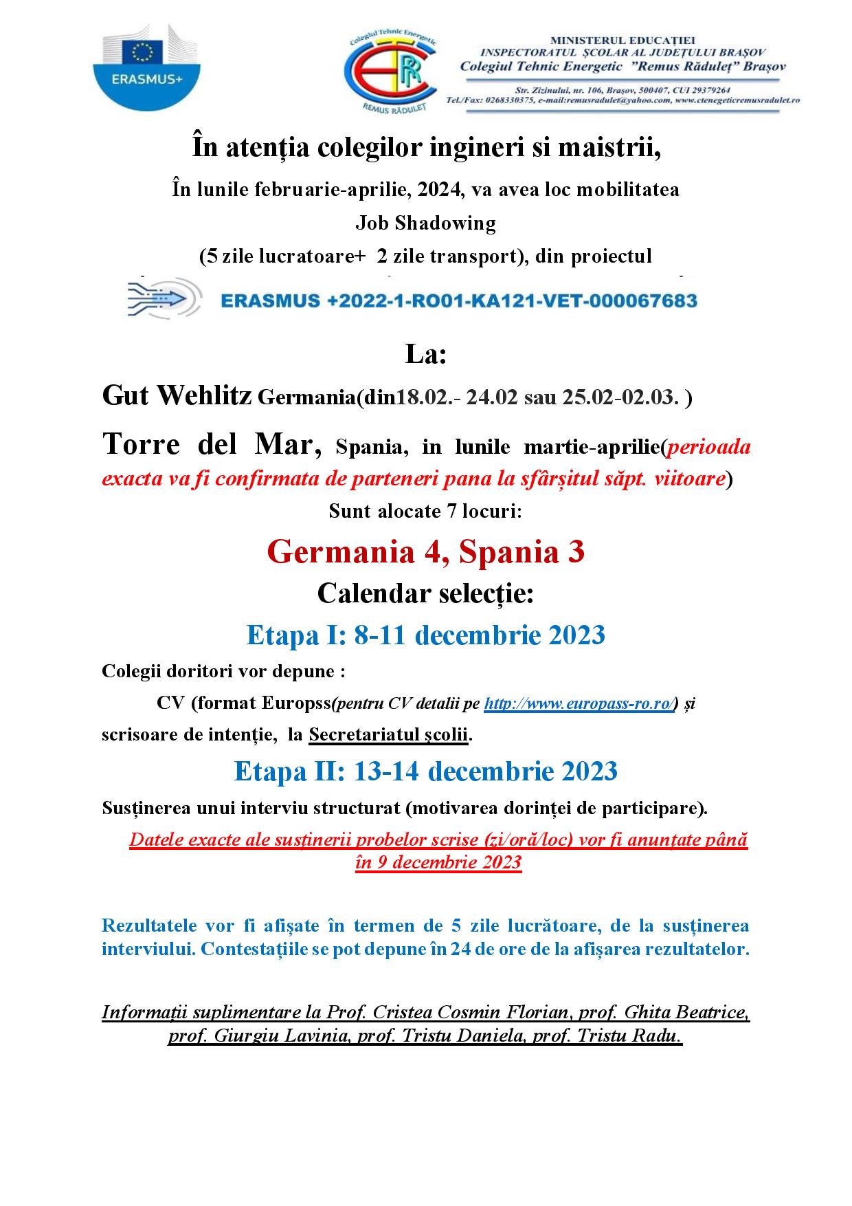 ANUNȚ SELECȚIE INGINERI ȘI MAIȘTRI PENTRU PROIECTUL ERASMUS+2022-1-RO01-KA121-VET-000067683