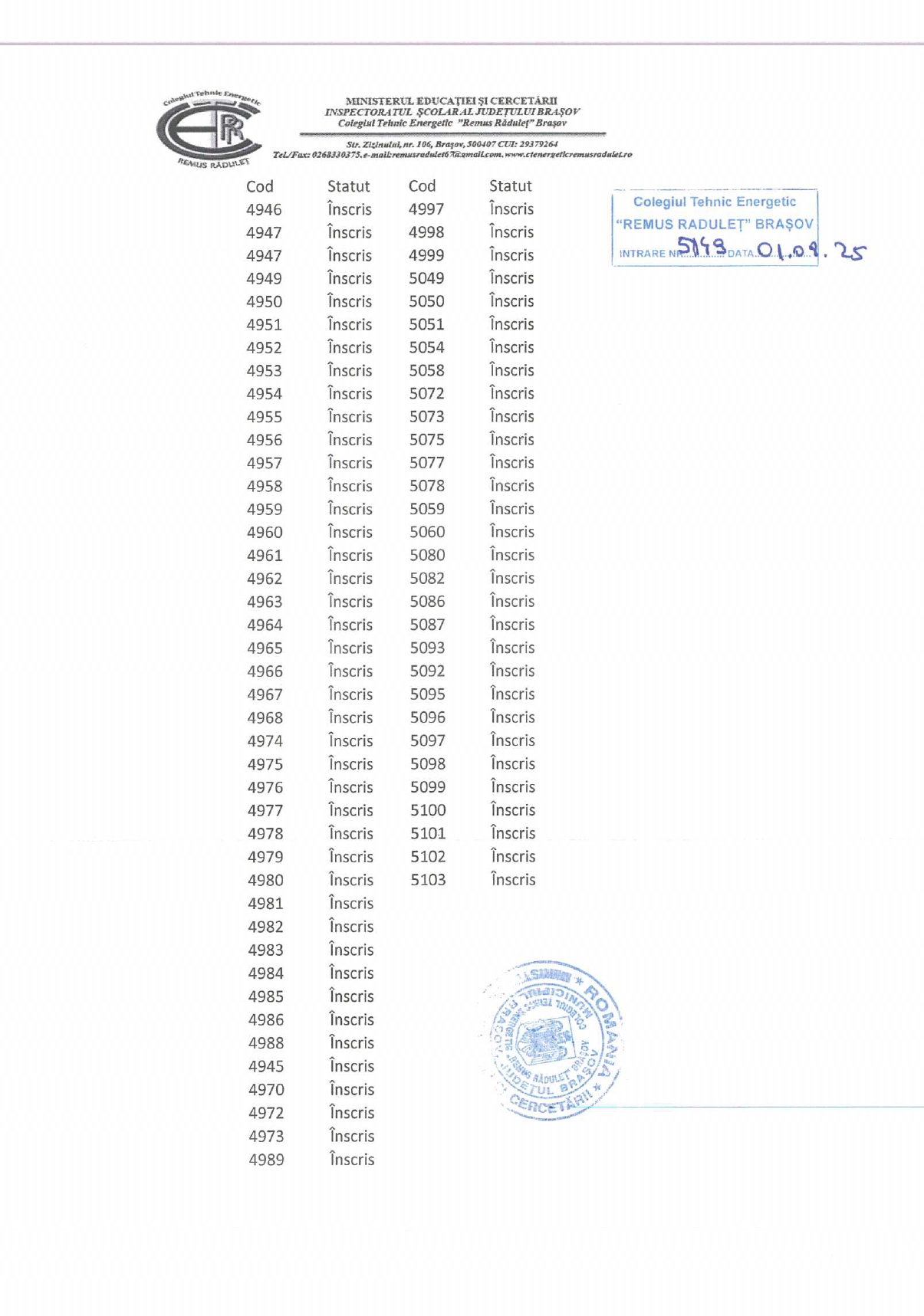 - candidații care încă nu au la dosarul de înscriere foaia matricolă aferentă ciclului inferior al liceului, trebuie să o aducă la secretariatul CTERR până în data de 14 august 2025, ora 13. În caz contrar vor pierde dreptul de înscriere în clasa a XI-a seral, în anul școlar 2025-2026.