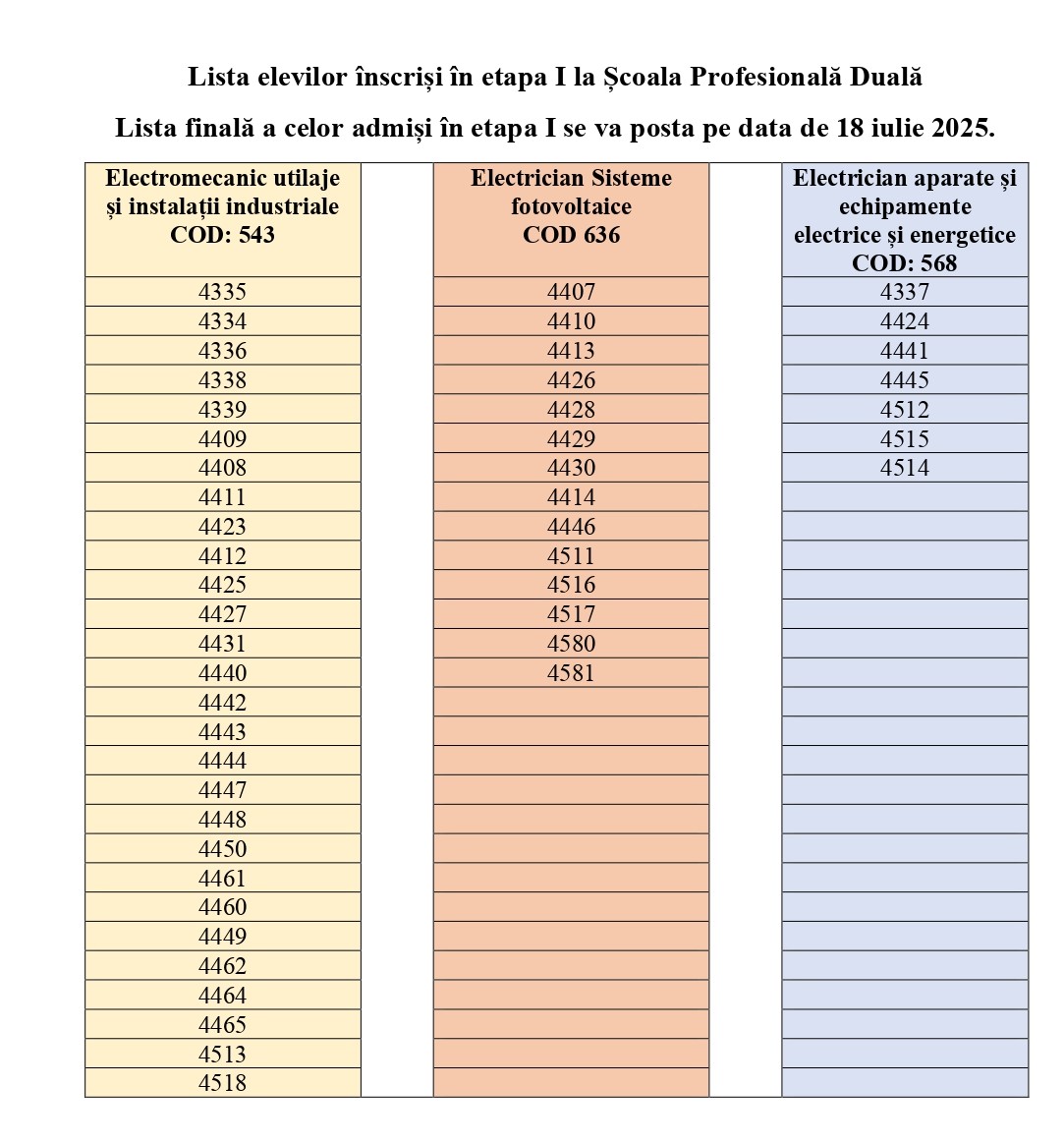 LISTA ELEVILOR ADMIȘI ÎN ETAPA I LA ȘCOALA PROFESIONALĂ DUALĂ