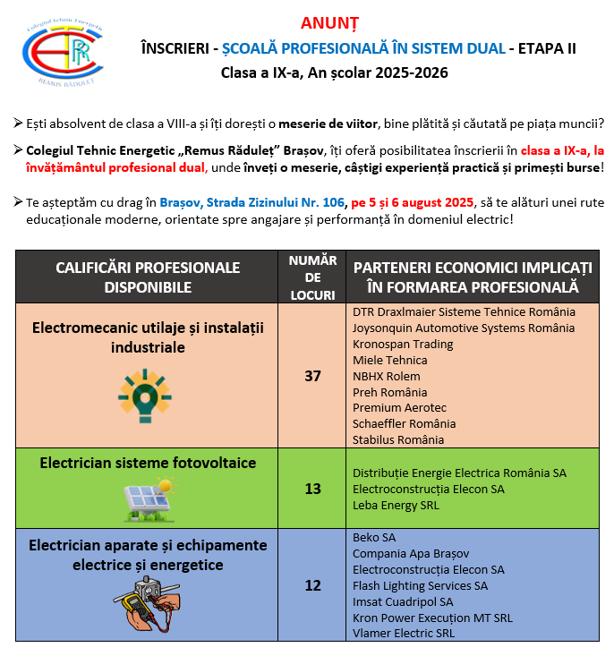 ÎNSCRIȘI ȘCOALA PROFESIONALĂ DUAL ETAPA A II - A