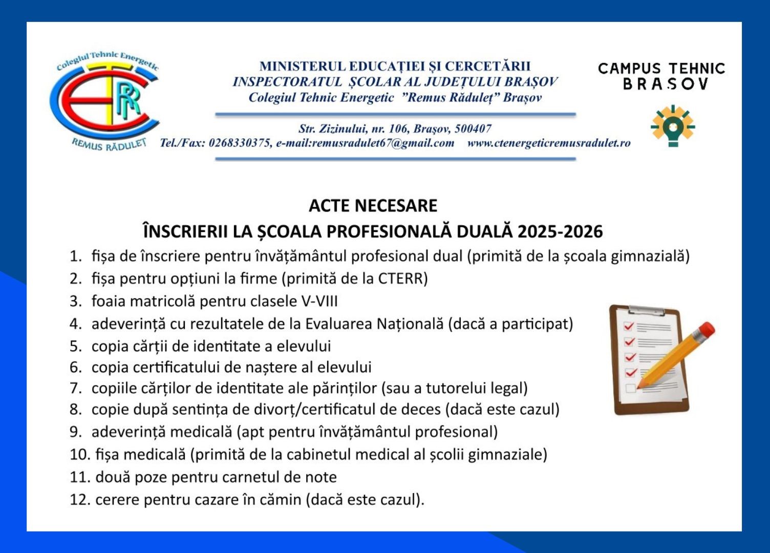 ACTE NECESARE ÎNSCRIERII LA ȘCOALA PROFESIONALĂ DUALĂ